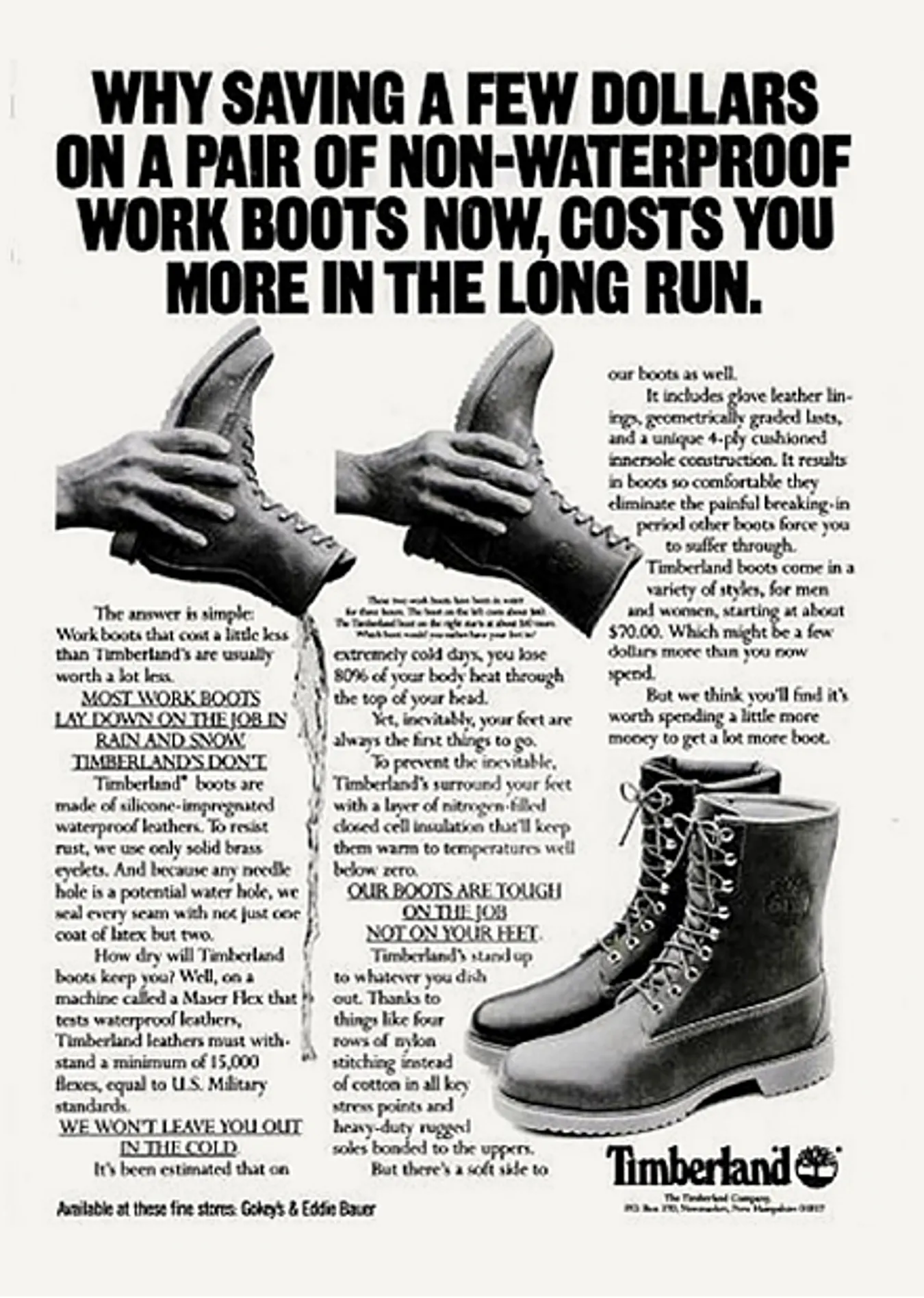 Когда в 70-х эти ботинки вышли на мировой рынок, рекламные слоганы гласили: «Если вы любите Timberland, относитесь к ним как можно хуже». Качество до сих пор остается одним из главных преимуществ Timberland — их обувь можно смело назвать неубиваемой.